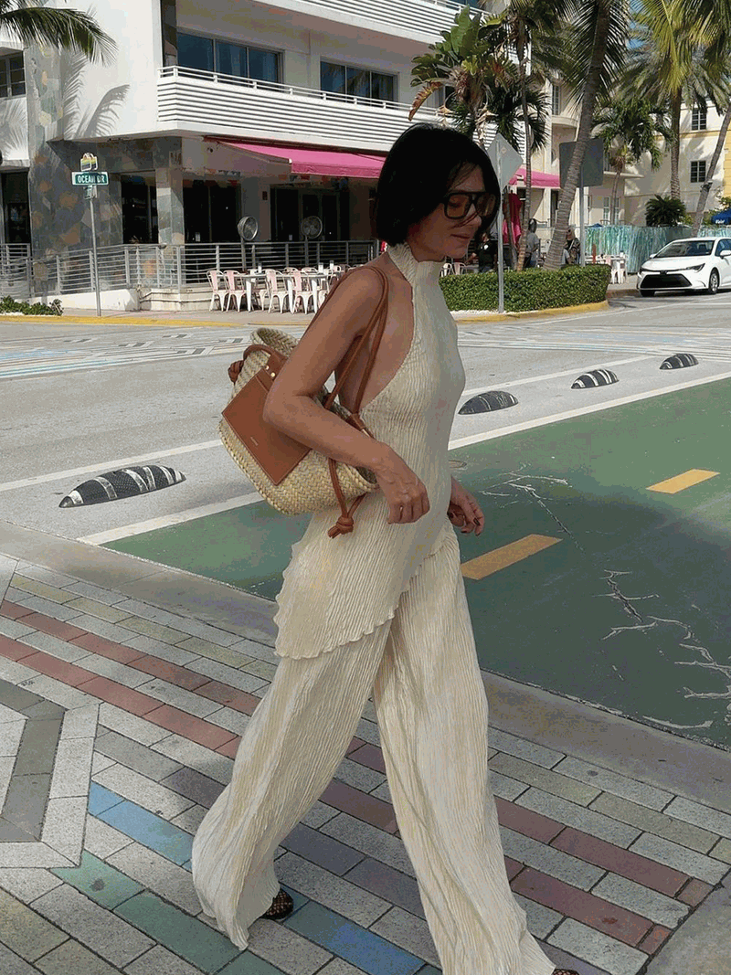 Lassen Sie sich von unserem Set Pia verzaubern! Ein stylischer Zweiteiler im trendigen Plissee-Design in Creme und Weiß. Die Hose ist weit und locker geschnitten und hat einen bequemen Gummibund. Dazu passt ein rückenfreies Oberteil mit markantem Kragen und asymmetrischem Schnitt, der sich nach vorne verjüngt.